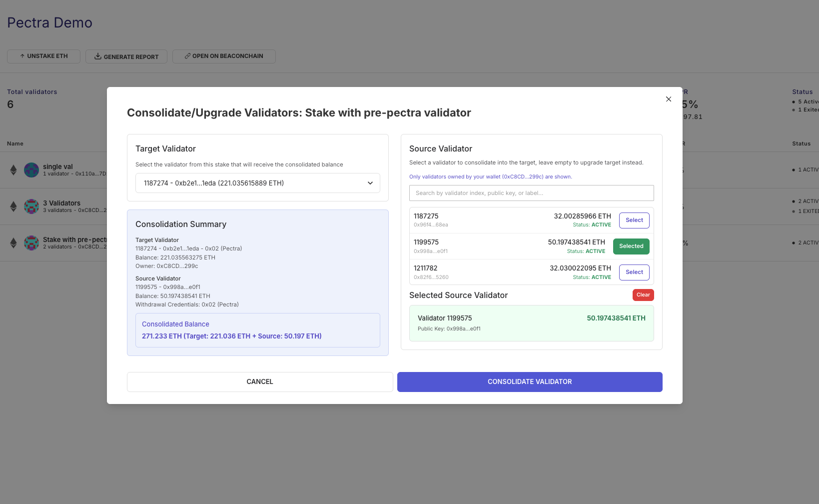 Pectra validator management is available in the Control Centre, see demos of the follow functionality below: